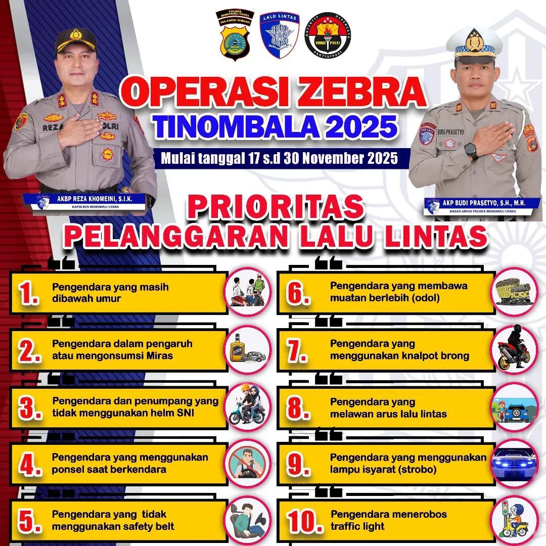 Morowali Utara – Polres Morowali Utara menggelar apel pelaksanaan Operasi Zebra Tinombala 2025 yang berlangsung selama 14 hari, terhitung mulai 17 hingga 30 November 2025, di halaman Mapolres Morowali Utara, Senin (17/11/2025). Operasi ini bertujuan meningkatkan disiplin berlalu lintas sekaligus menekan angka pelanggaran, kecelakaan, dan fatalitas di wilayah Kabupaten Morowali Utara menjelang perayaan Natal 2025 dan Tahun Baru 2026.
